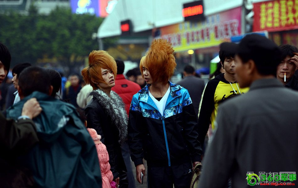 2013年1月26日,广州火车站附近,几名染着黄头发的乘客。