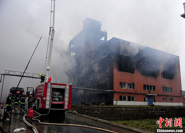 2月25日,贵阳市白云区麦架镇的柏丝特化工有限公司一生产车间发生原材料泄漏燃烧事故,目前已造成该厂5名员工受伤,近3万名民众转移。图为已被烧焦的工厂车间。