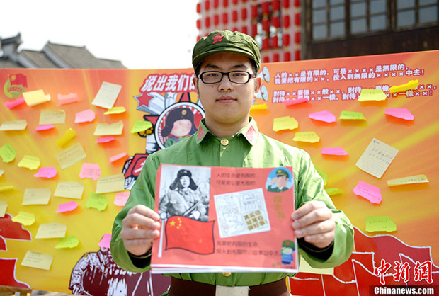 3月4日上午,无锡南长区团委组织了一支由社区居民、青年社工、在校大学生为主的青年志愿者队伍,分别在养老院、医院、居民区等地宣传雷锋精神,其中尤为惹人注目的是一批穿着军服“穿越”而来的“雷锋们”,他们驻守在古运河畔,为往来的游客宣读自创的“雷锋体”。图为一名志愿者展示着他们的宣传单。