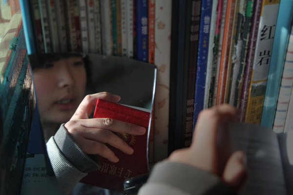 一名女生在读毛泽东语录。