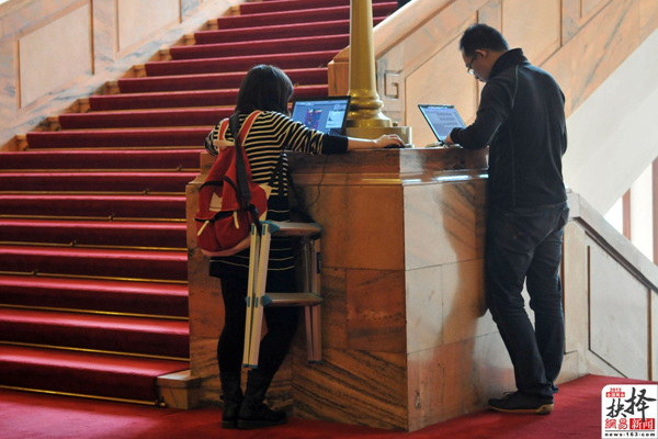 3月3日,北京,在两会现场发稿的新闻记者。