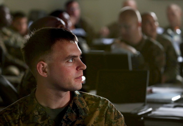 《产经新闻》2月25日报道称,在日本冲绳县6个基地内,大约驻守着8000名美海军陆战队队员,他们每天都要进行严酷的训练。海军陆战队是美军的精锐部队,一旦发生紧急情况,他们将第一时间赶赴前线。图为美军士兵参加日本文化与冲绳历史讲座。