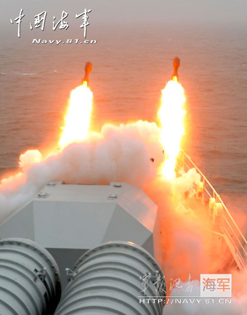 我军铜陵号舰猛射火箭深弹攻击“潜艇”(1)(2)
