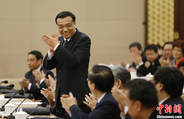 3月4日,中共中央政治局常委、国务院副总理李克强看望出席全国政协十二届一次会议的经济、农业界委员并参加联组讨论。图为李克强起立为委员的精彩发言鼓掌。