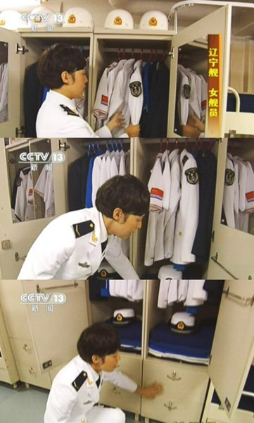 每个女舰员都有独立的储物柜和衣柜,柜锁独立,请注意图中衣柜中左侧白色短袖有海军军旗标志,据了解,这件衣服为海军新型制式体能服,下图军帽和枕头不能摆放在床上,而是放在柜子里。